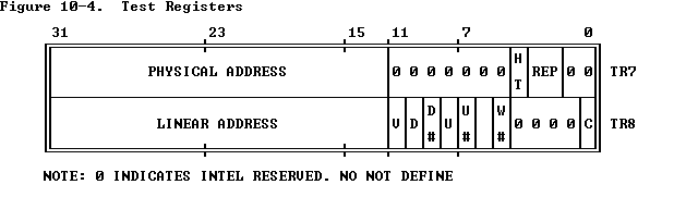 Two test registers, shown in Figure 10-4, are provided for the purpose of testing. TR6 is the test command register, and TR7 is the test data register. These registers are accessed by variants of the MOV instruction. A test register may be either the source operand or destination operand. The MOV instructions are defined in both real-address mode and protected mode. The test registers are privileged resources; in protected mode, the MOV instructions that access them can only be executed at privilege level 0. An attempt to read or write the test registers when executing at any other privilege level causes a general protection exception.